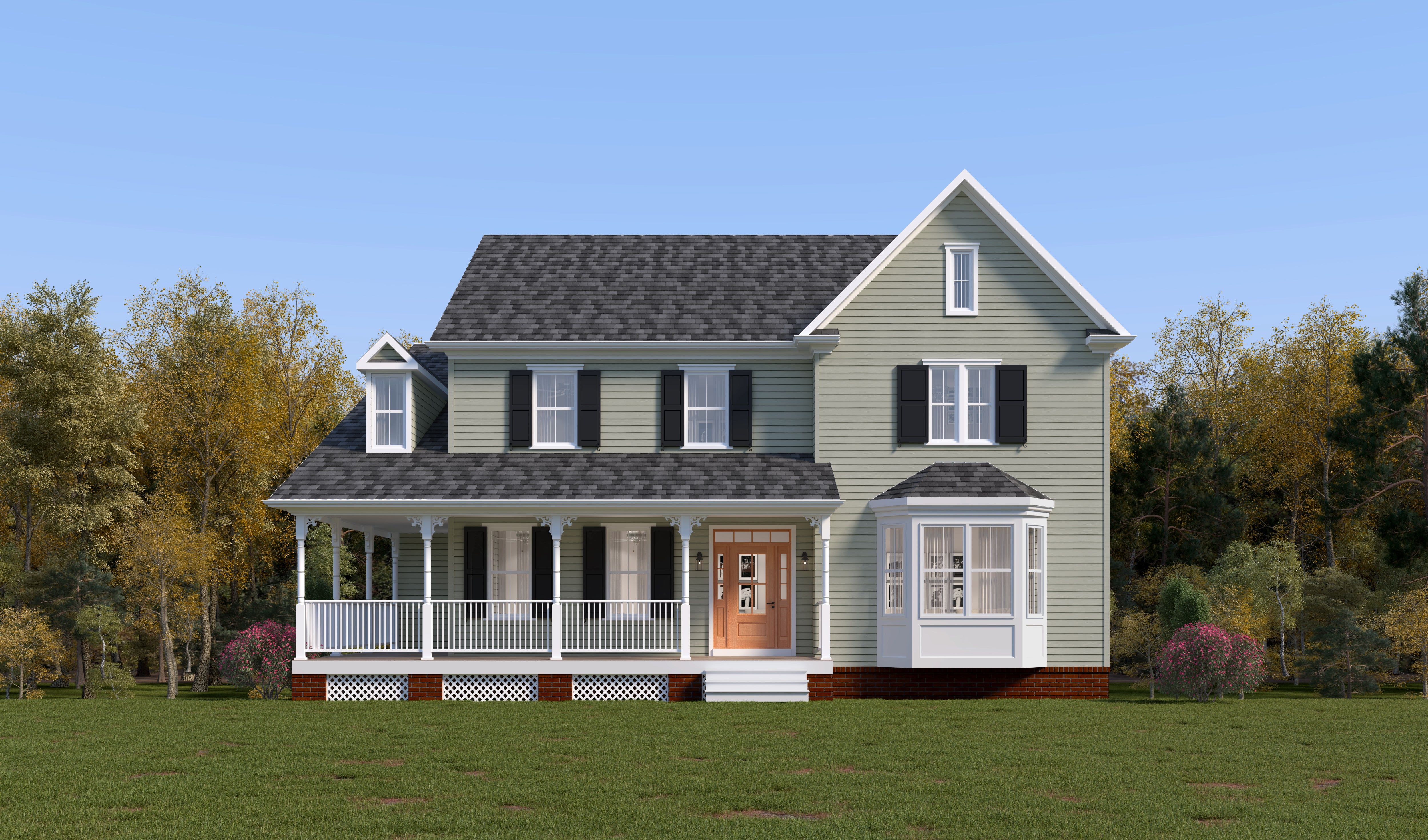 Two-story home with gray siding, black shutters, front porch, and bay window