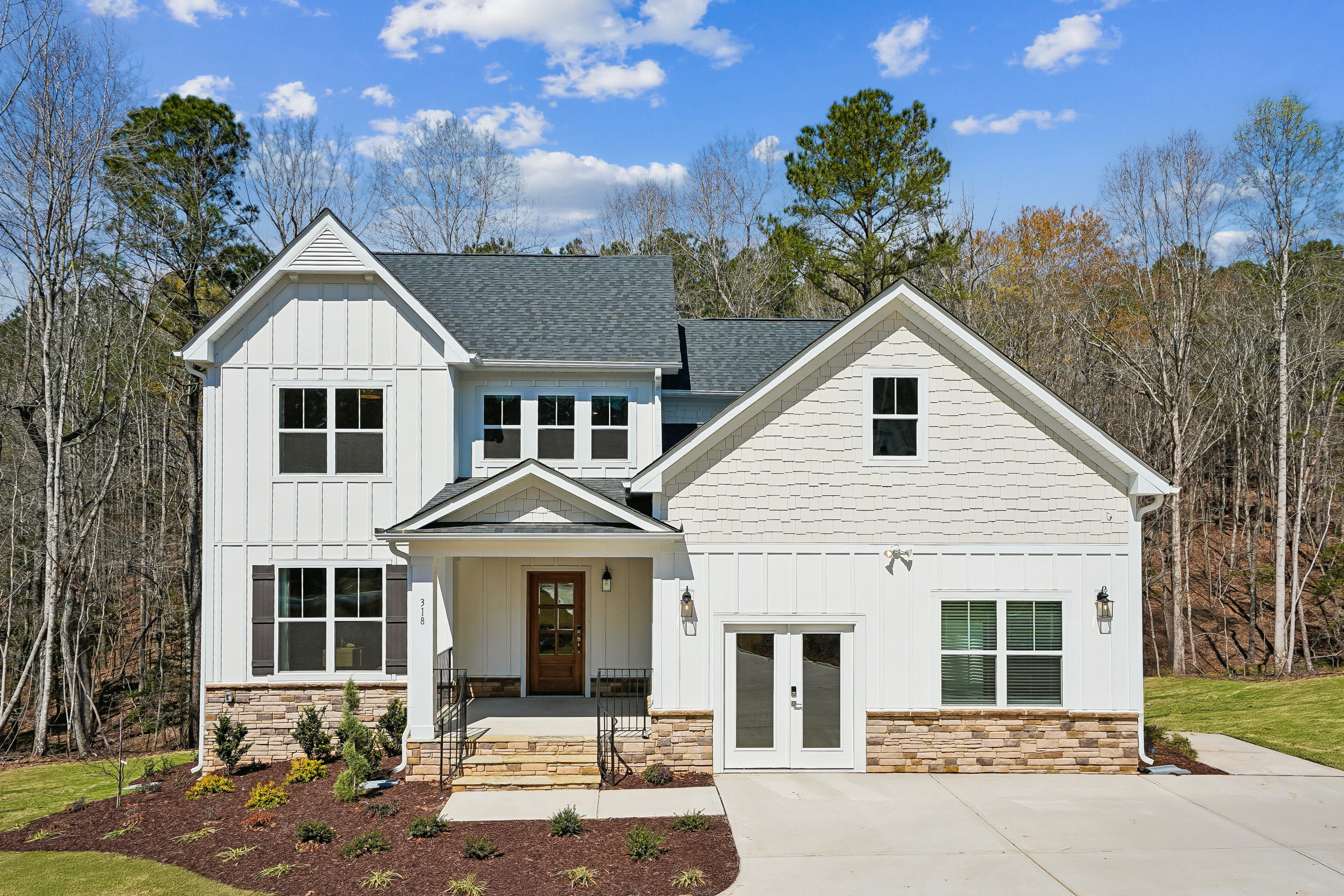 Two-story white farmhouse with board-and-batten siding, stone foundation, covered front porch, and wooded backyard setting.
